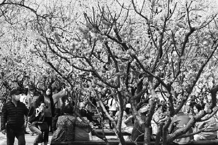 明城墙遗址公园梅花盛开,市民戴口罩赏花。 本报记者 刘平摄