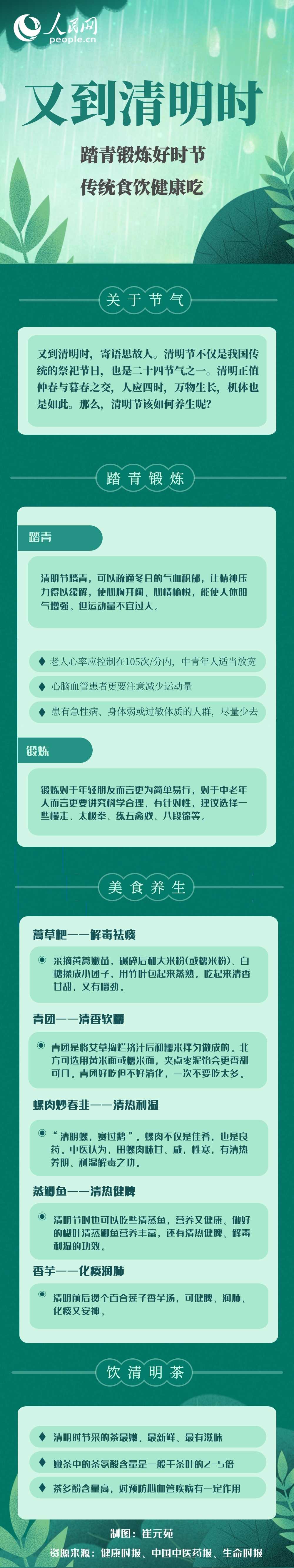 另外,清明时节正是花粉传播的时期,建议患有急性病、身体弱或过敏体质的人群,要尽量少去踏青,避免直接接触各类容易诱发过敏症状的植物。清明时节锻炼,对于年轻朋友而言可能更为简单易行,但对于中老年人而言则更要科学合理、有针对性。建议选择慢走、太极拳、练五禽戏、八段锦等运动。