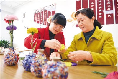 日前,安徽省合肥市肥西县上派镇“爱和家”居家养老服务中心正式开放,为周边老人提供休闲娱乐、基本医疗、餐饮等服务。图为一位老人(右)在该中心学习制作手工艺品。