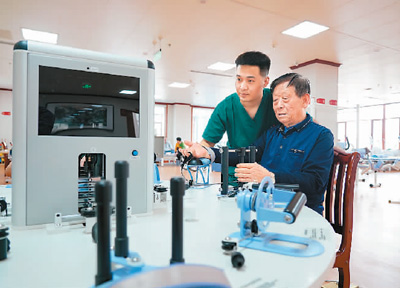 近年来,河北省唐山市古冶区探索推进“医养结合”养老模式,整合养老和医疗两方面资源,打造集养老护理、医疗康复于一体的托老中心,为老人提供持续性、针对性的医疗、养老服务。图为居住在古冶区安馨医疗养老庄园的老人正进行康复训练。
