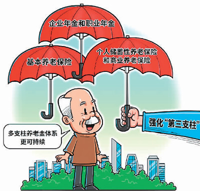 据了解,国际上普遍采用国家、单位、个人养老责任共担的三支柱养老保险体系。在中国,第一支柱为基本养老保险,第二支柱即企业年金和职业年金,第三支柱包括个人储蓄性养老保险和商业养老保险。
