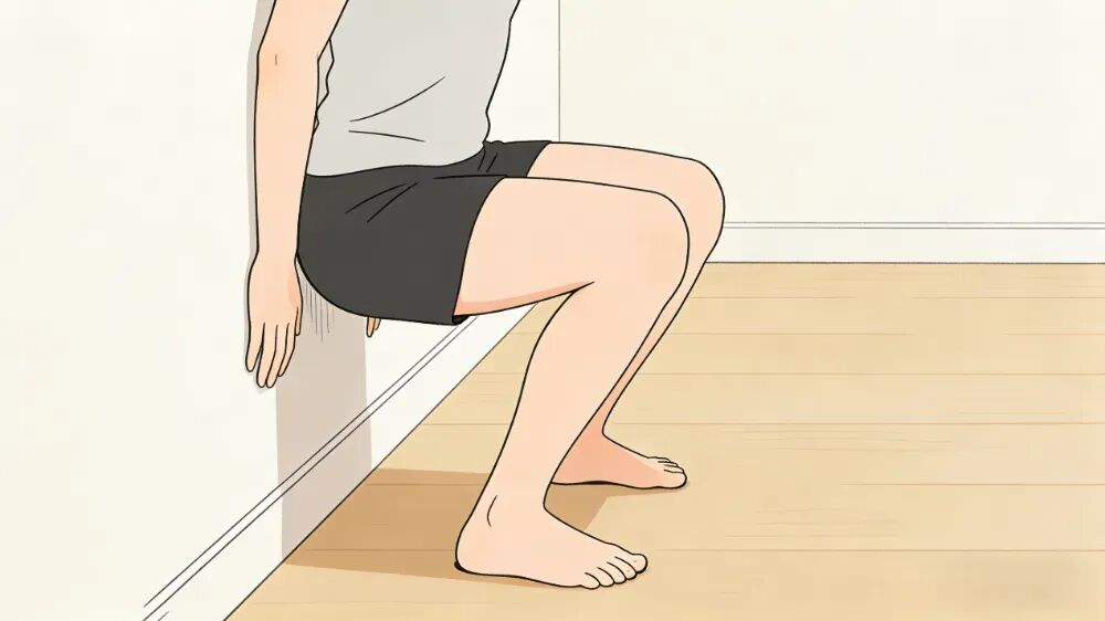 做法:找稳固椅子靠墙放,预先收紧核心,身体整体向前倒,借助重力收紧臀部和大腿前侧,顺势站起(仅微微离开椅面即可),双手可放腿上感受发力,不借力撑腿;