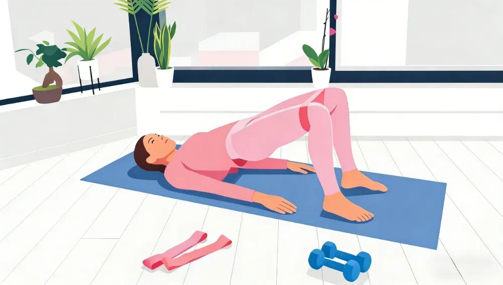 4.臀桥训练:仰卧屈膝,脚掌贴地,缓慢抬起臀部至肩髋膝呈一条直线,顶峰收缩1-2秒,12次为一组,强化核心肌群。