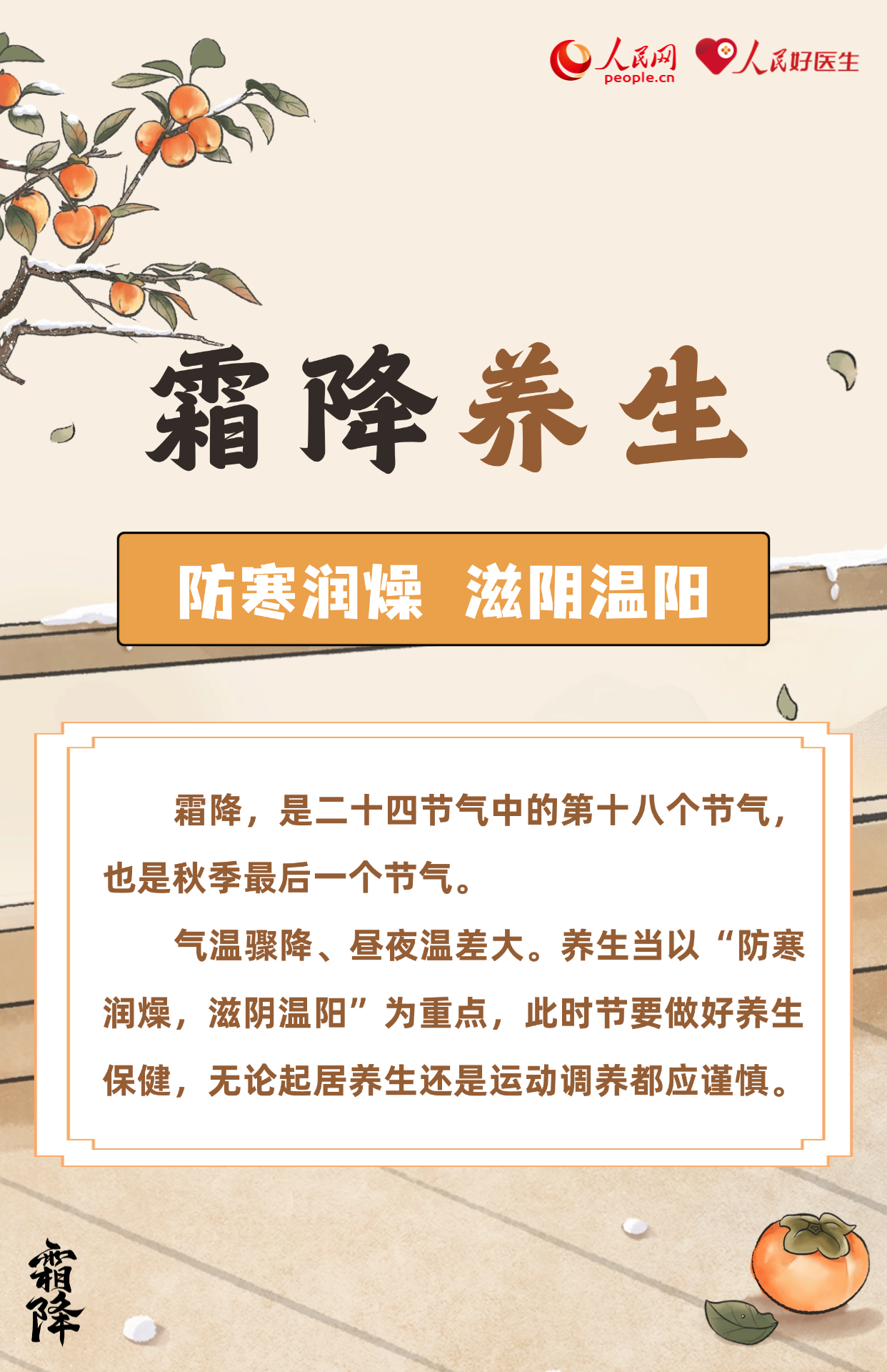 霜降,是二十四节气中的第十八个节气,也是秋季最后一个节气。气温骤降、昼夜温差大。养生当以“防寒润燥,滋阴温阳”为重点,此时节要做好养生保健,无论起居养生还是运动调养都应谨慎,湖北省中医院治未病中心主任医师杨帆为大家带来深秋养生攻略。
