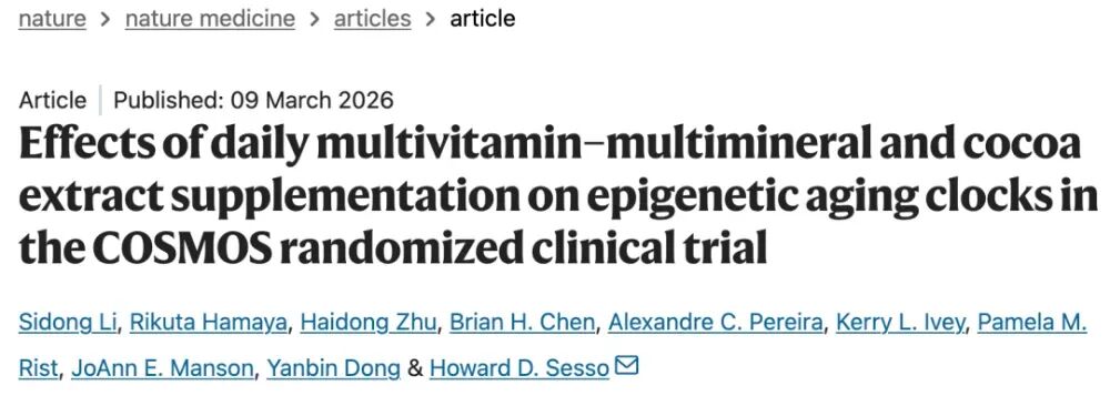 来自哈佛大学等机构的研究团队发表于Nature Medicine的一项研究,是首个证实复合维生素能延缓表观遗传衰老的重磅研究。